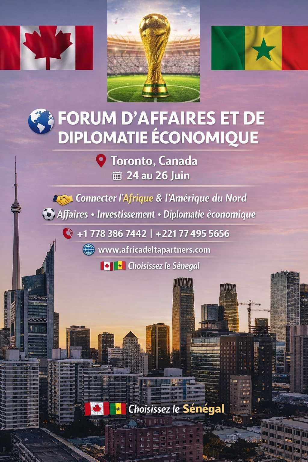 Le Forum d’Affaires et de Diplomatie Sénégal – Canada 2026, prévu du 24 au 26 juin 2026 à Toronto (Canada), est une initiative stratégique visant à renforcer et structurer la coopération économique, diplomatique et institutionnelle entre le Sénégal, l’Afrique de l’Ouest et l’Amérique du Nord. Il s’inscrit dans une dynamique de promotion de partenariats durables, innovants et à forte valeur ajoutée.